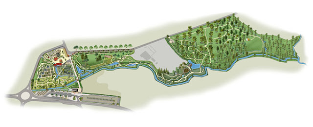 En esta zona se pueden encontrar topiarias, arbustos ornamentales, plantas orientales, rocalla, plantas acuáticas ornamentales, bonsais, camelias, entre otras muchas. Además también se puede visitar la Fuente de Talavera, la Caseta de Baños con exposición de F. Valdés, el arroyo Peñafrancia, el paseo de las Hespérides, el laberinto de Tejos, la pista de tenis, la Mesona, el Cenador, las Piscina, el Estanque de la Noria y la preciosísima Alineación de Plátanos.